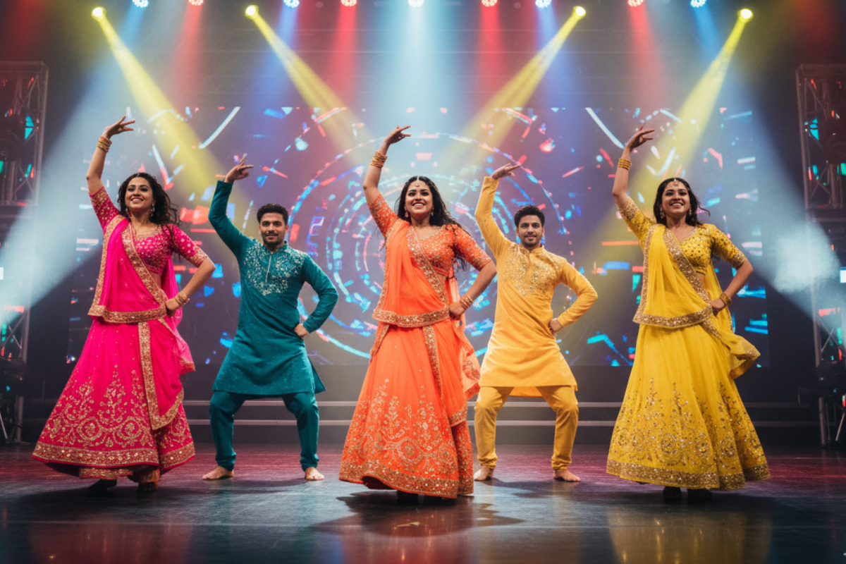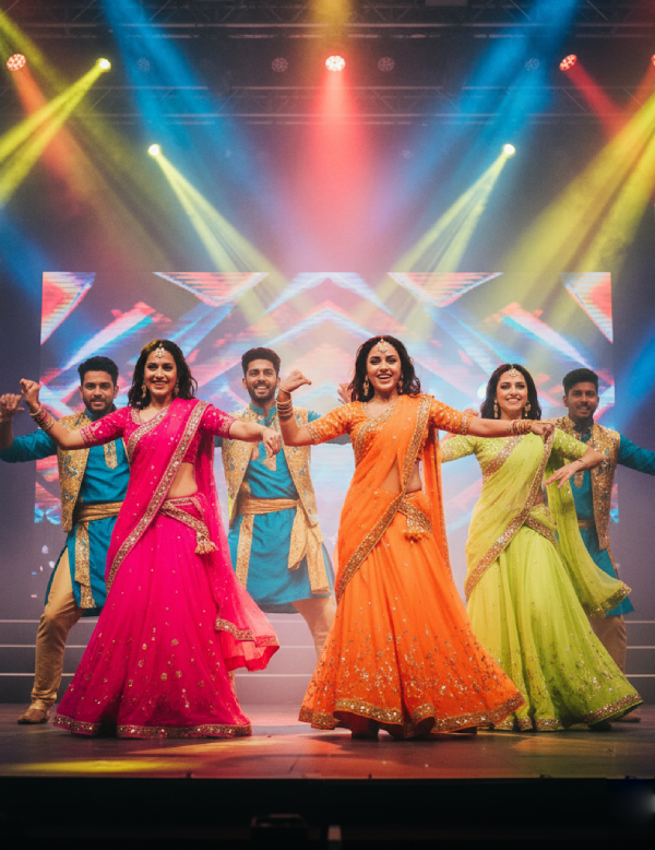 Energetic cinematic dance inspired by Indian film choreography.